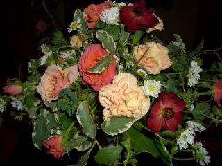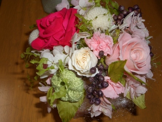 バラと白のスカビオサが優しい色合いで